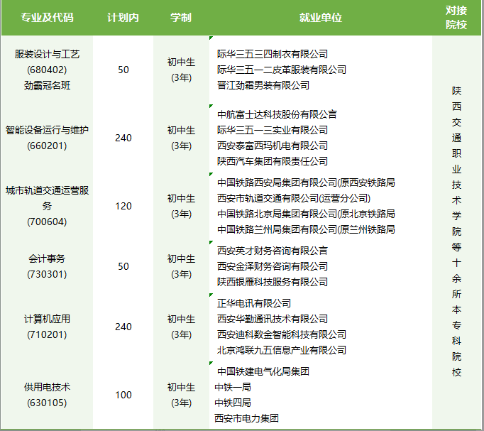 就业单位:中国铁路西安局集团有限公司(原西安铁路局);西安市轨道交通有限公司(运营分公司);中国铁路北京局集团有限公司(原北京铁路局);中国铁路兰州局集团有限公司(原兰州铁路局)